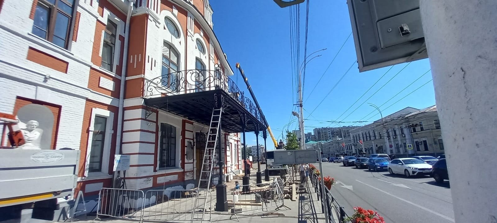 При совместном участии руководства Тамбовской области и строителей-реставраторов и нашей компанией был изготовлен главный козырек здания института музыки и искусства г.Тамбова. По старым чертежам и фотографиям были воссозданы все элементы металлической части в том числе чугунные колонны и кованые ограждения козырька. Небольшие изменения были внесены архитекторами и конструкторами ,а нами исполнены работы по изготовлению вида крыши , для обеспечения полной герметизации и отвода ливневых вод с учетом их удаления с верхней части навеса. Но, самым главным не примечательным, и в то же время основным элементов декора является центральный фонарь, который так же был изготовлен по единственной фотографии прошлых лет.